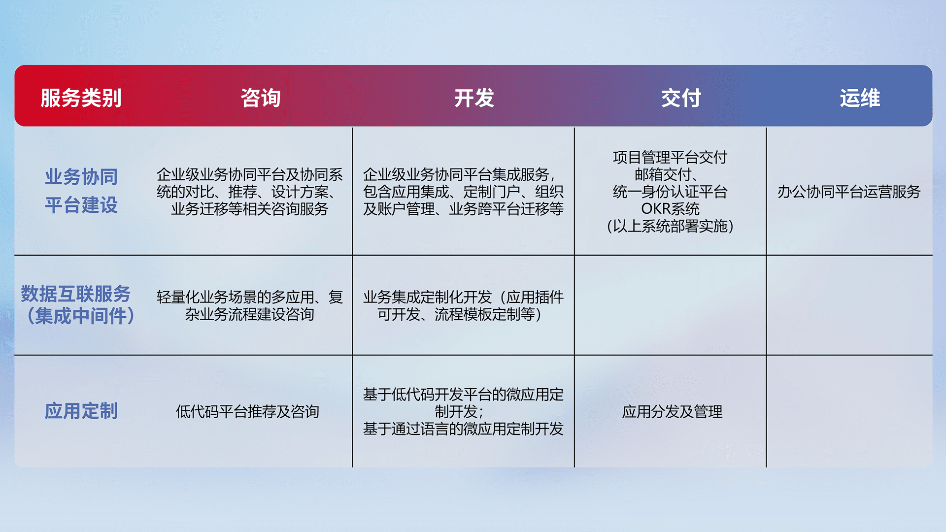 针对钉钉、、、企微、、、IDaas等平台级产品提供产品的规划、、、方案、、交付、、、、定制化开发等服务,,,实现如统一协同办公、、智能客户服务、、混合会议管理、、、、智能数据查询、、、等业务场景,,,实现数字化转型。。