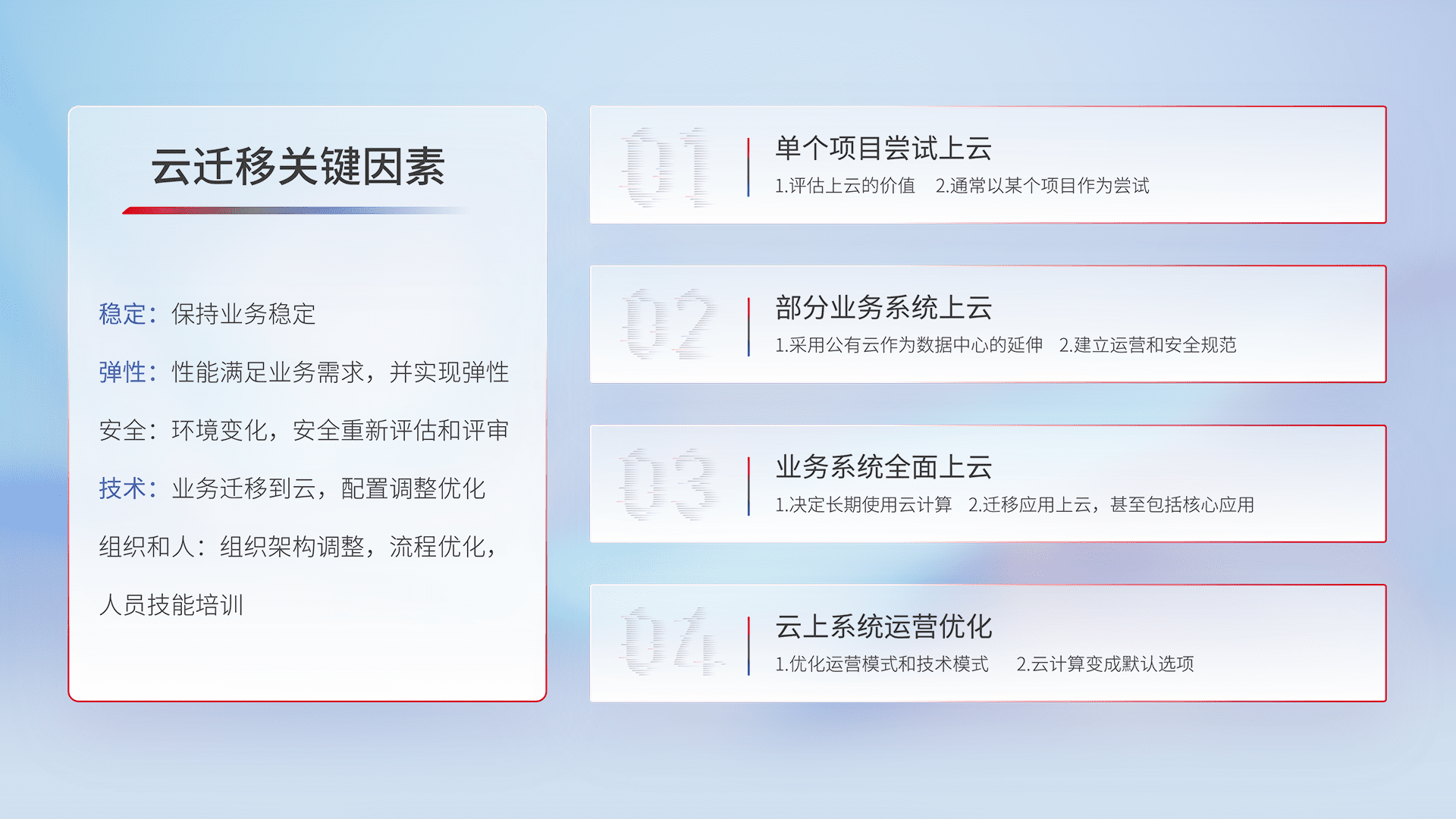 结合实际业务,,从规划设计、、、云平台选型、、、云原生改造、、、数据迁移、、、、集成交付,,,迁移全过程为客户识别最佳上云路径,,,做好风险识别管理,,,,设计网络架构、、、、身份权限、、、安全审计合规、、操作审计、、、、日志审计、、监控告警策略、、多站点容灾设计等,,对云上基础设施进行整体规划,,,,提升IT治理水平,,,以满足弹性、、、、高可用、、、、高性能的需求。。。