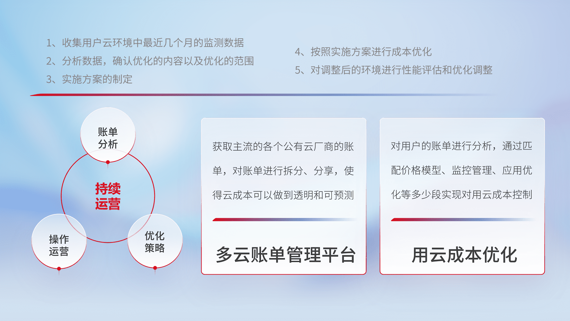 通过多云纳管,,以统一的资源数据模型把客户的云资源进行抽象和封装,,,进而实现对多云资源的统一操作,,保障云资源管理的可靠性、、稳定性与可用性。。。量身定制化运维内容,,,配置、、开发运维、、、、补丁管理、、、、备份、、监控、、认证和访问管理、、审计和日常巡检等,,,保障在用云过程中的可靠度,,稳定度以及高可用率。。。。